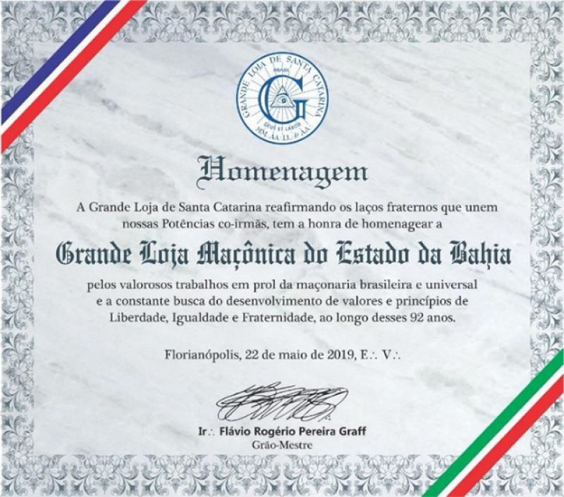 | Publicado emm: 28/06/2019 por Administrador nº No dia 15 de junho, do presente, o Grande Secretário de Relações Exteriores, Irmão Orlando de Oliveira Reis, representando o Sereníssimo Grão-Mestre da Grande Loja de Santa Catarina, Irmão Flávio Rogério Pereira Graff, participou da Assembleia Geral Comemorativa aos 92 da Grande Loja Maçônica do Estado da Bahia. Na ocasião, além da celebração da efeméride, a GLEBA comemorou o reconhecimento da sua regularidade pela Unida Grande Loja da Inglaterra. O evento foi prestigiado por Grão-Mestres ou representantes das Grandes Lojas do Distrito Federal e dos estados do Rio Grande do Sul, Santa Catarina, Pernambuco, Sergipe, Maranhão, Mato Grosso, Mato Grosso do Sul, Rondônia e Acre do Supremo Conselho do Grau 33 do Rito Escocês Antigo e Aceito, e do Grande Oriente do Brasil – Bahia. |