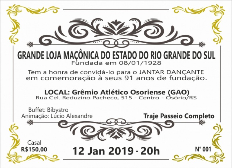 | Publicado emm: 03/01/2019 por Administrador nº Já estão à venda os convites para o Jantar Dançante em comemoração aos 91 anos da Grande Loja Maçônica do Estado do Rio Grande do Sul. O evento será no dia 12 de janeiro de 2019, às 20 horas, no Grêmio Atlético Osoriense, rua Cel. Reduzino Pacheco, 515, centro de Osório. Os interessados devem entrar em contato com os seguintes Irmãos do Litoral: Luiz Carlos Peres de Latorre - (51)998-687-095 Mário Oscar Piccoli - (51)995-044-344 Paulo Roberto Gomes Xavier - (51)996-906-233 |
